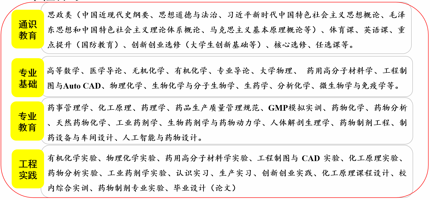 培养目标:该专业培养具备药物制剂的基础知识、基本理论和基本技能,能够在药物制剂设计与制备、生产与应用等领域,从事药物制剂的研发、生产、质量控制、技术创新和应用等方面工作的高素质专门人才。