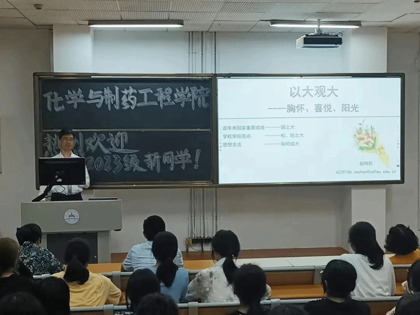 在见面会上,赵晓民经理作了名为《以大见大——胸怀 喜悦 阳光》的报告,在报告中给同学们详细地分析了制药工程专业在公司的发展前景、学习内容、以及未来的就业形势。