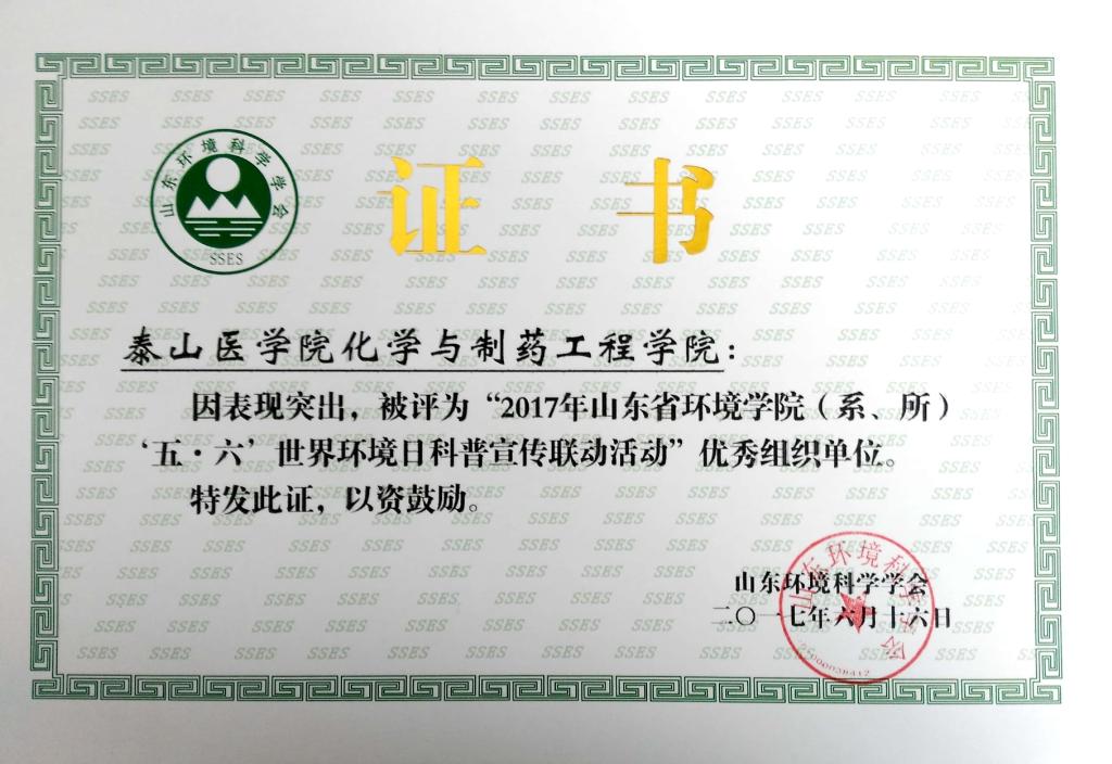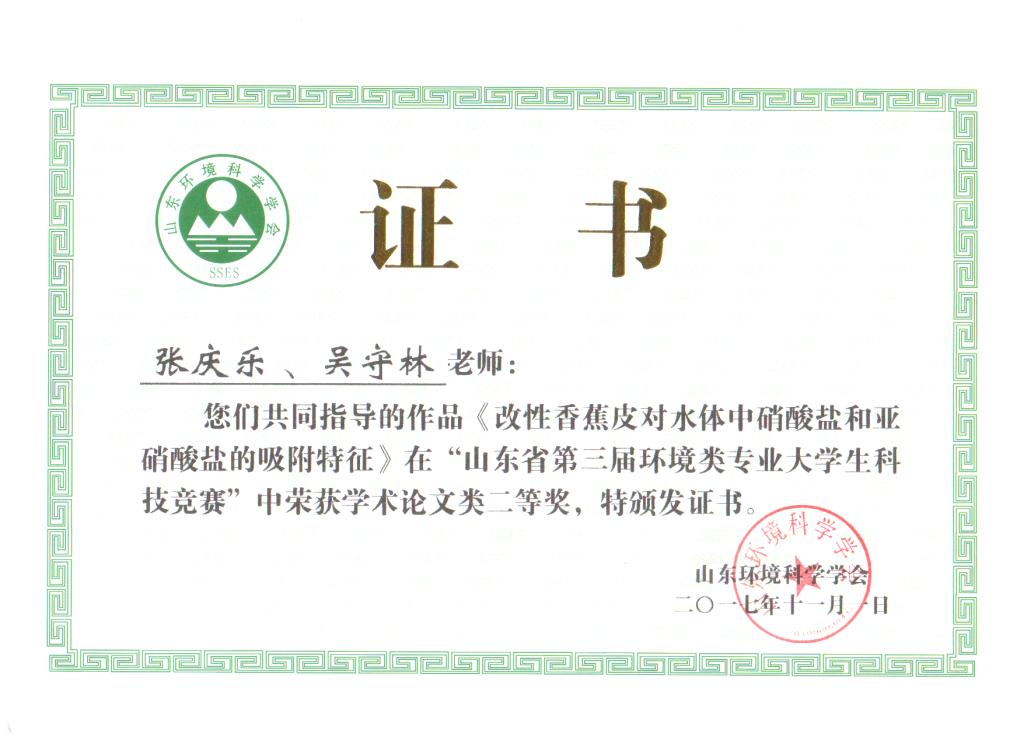 2014级应用化学专业陈家驹、2015级环境工程专业谢雪晴、2015级化学工程与工艺专业罗景泉、2016级环境工程专业毛传雨、2016级化学工程与工艺专业赵乐凯被评为“优秀志愿者”,吴守林和张庆乐老师被评为“优秀指导教师”。另外,推荐3件作品参加山东省第三届环境类专业老员工科技竞赛,其中张庆乐和吴守林老师指导2013级环境工程专业李庆山、魏永腾、秦文欣、穆艾伟和吕务娟申报的“改性香蕉皮对水体中硝酸盐和亚硝酸盐的吸附特征”获学术论文类二等奖;张丽青和张庆乐老师指导2013和2014级环境工程专业张雨、兰如意、王义英、薛媛、党永辉申报的“改性大豆荚等生物质吸附剂的制备及其对印染废水的吸附处理系列研究”获学术论文类三等奖;李静和张庆乐指导2013和2014级环境工程专业徐淑倩、谷杰、王玥申报的“临沂市大气质量调查与评价”获调查报告类三等奖。