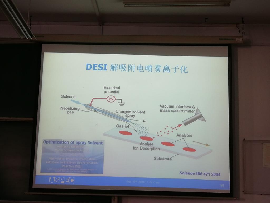 刘春胜博士围绕质谱技术尤其是现代色质联用发展瓶颈和由此衍生的DART、LESA、和AP MALDI等先进的原位质谱技术在精准检测、组学研究及质谱成像中的新进展及应用前景等几个方面的内容展开介绍。并在报告后与公司教师就共同关注的科研领域开展了广泛的探讨。