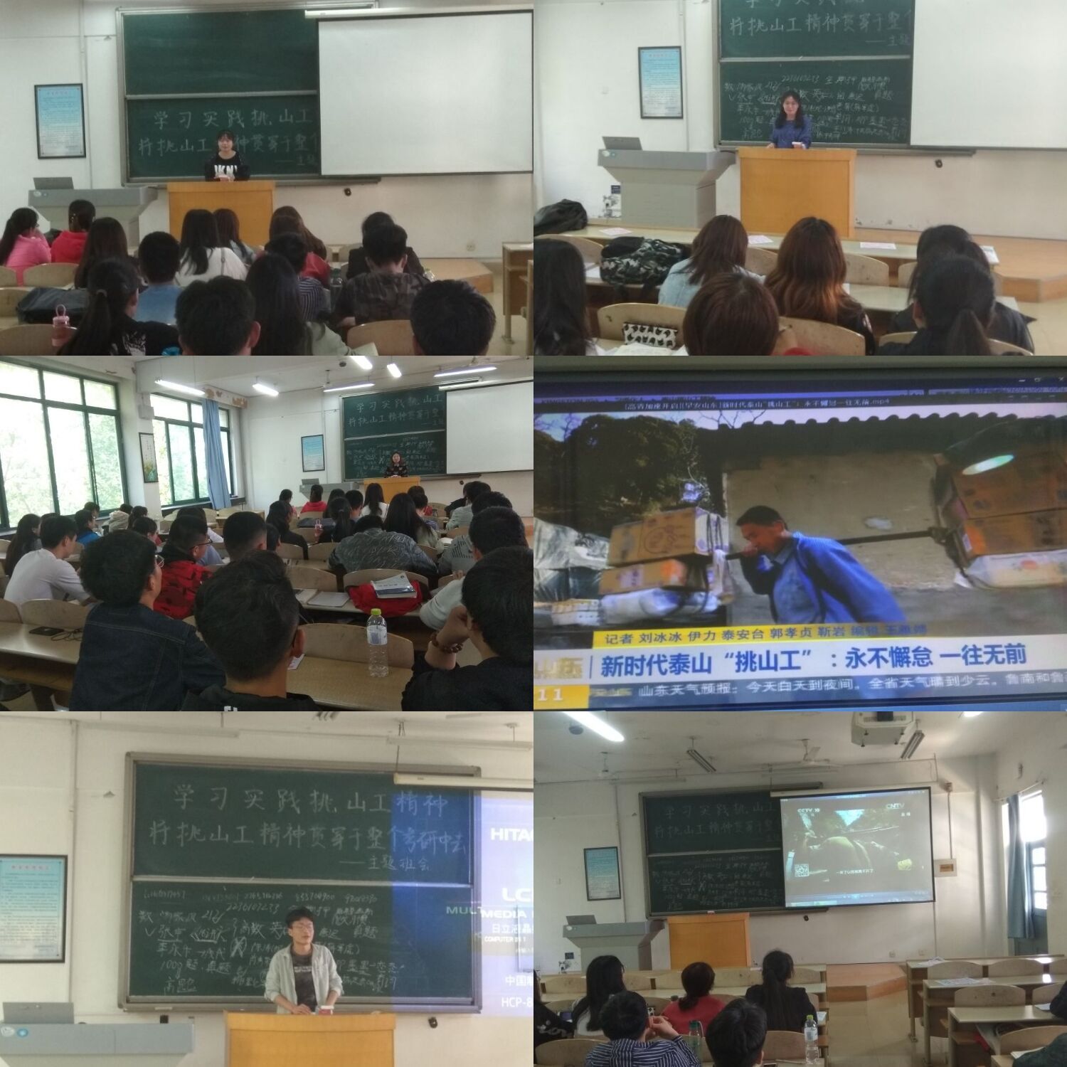 辅导员赵传华老师为大家播放了泰山挑山工的影像资料:泰山是中国古代文化的象征之一,自身魅力和自然条件催生了挑山工这一独特职业;挑山工认准目标,坚持不懈,始终走在自己的道路上;泰山挑山工精神可概括为:埋头苦干,勇挑重担,永不懈怠,一往无前;昔日有300多名默默无闻的挑夫在泰山上上下穿梭,如今仅有三十几位还在岗位上继续坚持着。看完视频后同学们都感慨,无论是平时学习还是考研,都应该泰山挑山工一样永不懈怠,一步一步的扎实稳干。