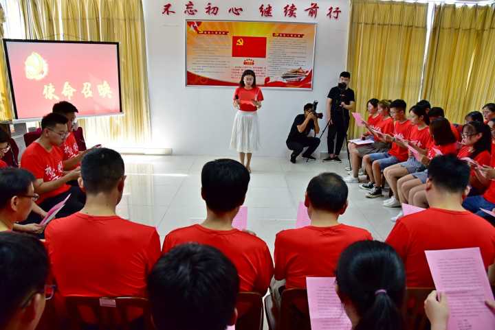 在誓言铮铮环节,支部全体党员站在鲜红的党旗下,新党员进行入党宣誓,老党员重温入党誓词。