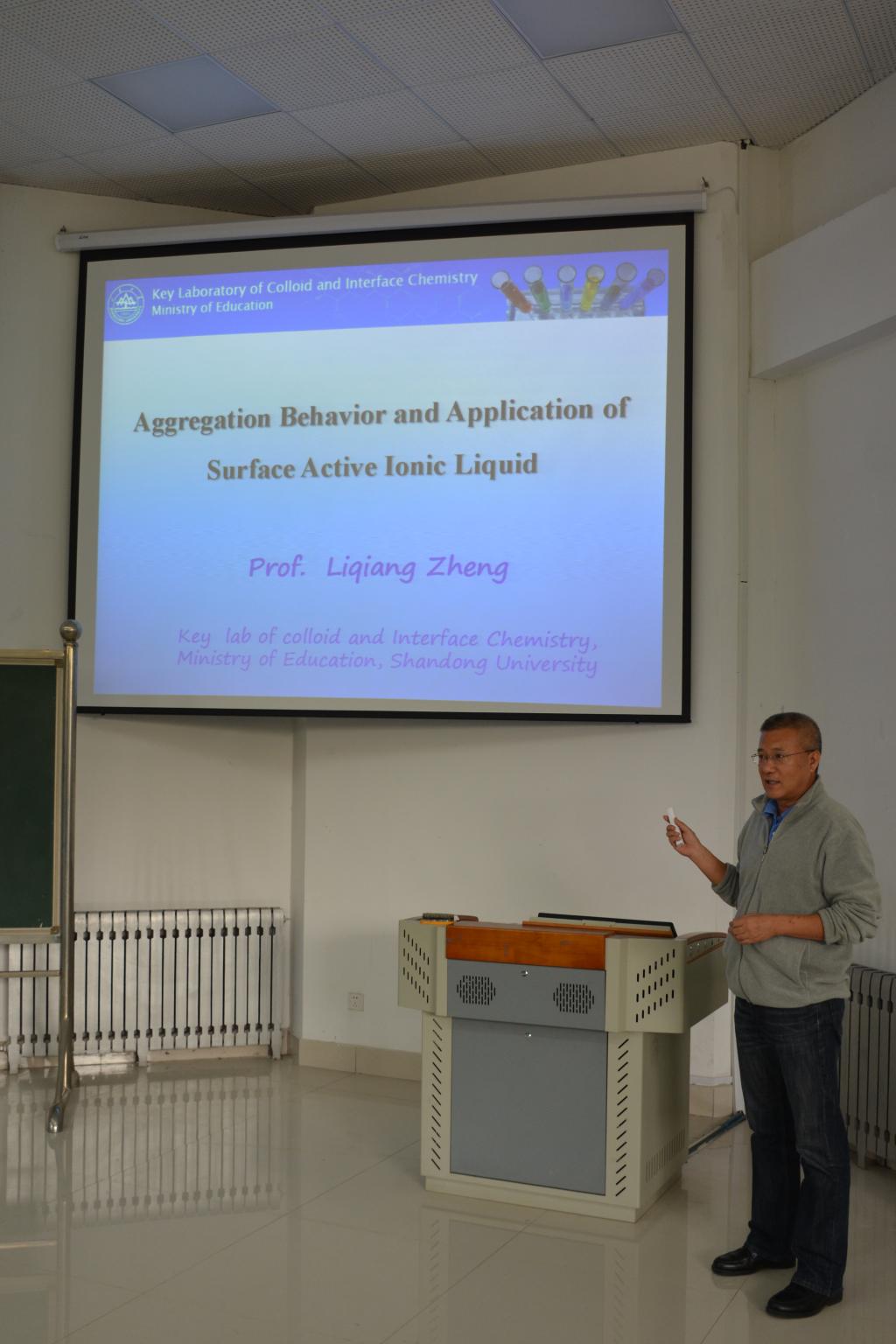 结合多年在离子液体聚集体方面的研究经历, 郑利强教授给大家介绍了离子液体的研究背景、理论基础,以及在纳米材料合成、离子传导、药物缓/控释方面的应用。报告结合了国内外研究人员研究实例以及郑利强教授本人国家重点基础研究发展计划、国家自然科学基金课题的研究成果进行深入浅出的讲解,并穿插讨论了论文撰写、投稿中遇到的各种实际问题及解决措施。内容材料丰富,既具有前瞻性,又有很强的实用性,不时博得阵阵掌声。报告后,郑教授与师生进行了积极互动交流,对大家的问题进行详尽的解答。