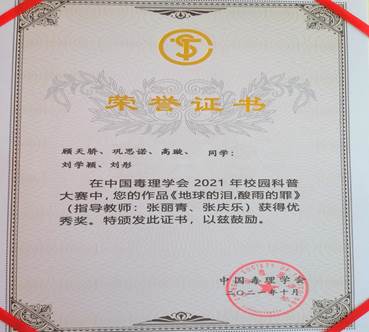 近年来,beat365亚洲体育官方网站环境工程教研室高度重视培养员工的专业素养和责任担当意识,积极指导本科生参加环境类专业各类国家级及省级竞赛,并在近期的第四届中国毒理学会校园科普大赛中获得优秀作品奖。员工通过参加竞赛更好地掌握了专业知识,提高了专业能力,为今后继续深造学习和参与祖国的环保事业打下了坚实的基础。