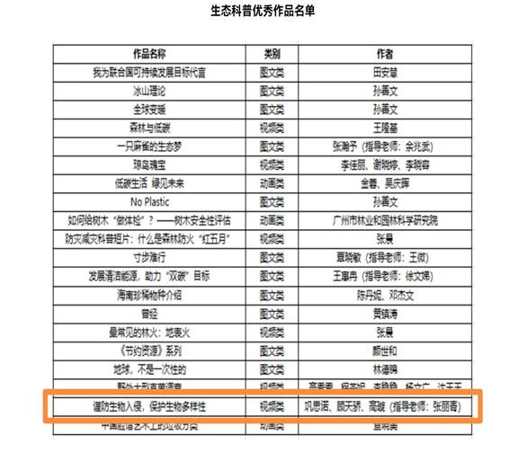 近期beat365亚洲体育官方网站环境工程专业本科生在张丽青老师指导下,其视频作品《谨防生物入侵,保护生物多样性》获得“关注绿色发展,建设生态文明”生态科普作品征集活动优秀作品奖。该活动系中国生态学学会举办,旨在提高公众生态环境意识和科学素养水平,推进绿色发展和生态文明建设,共建美丽中国。