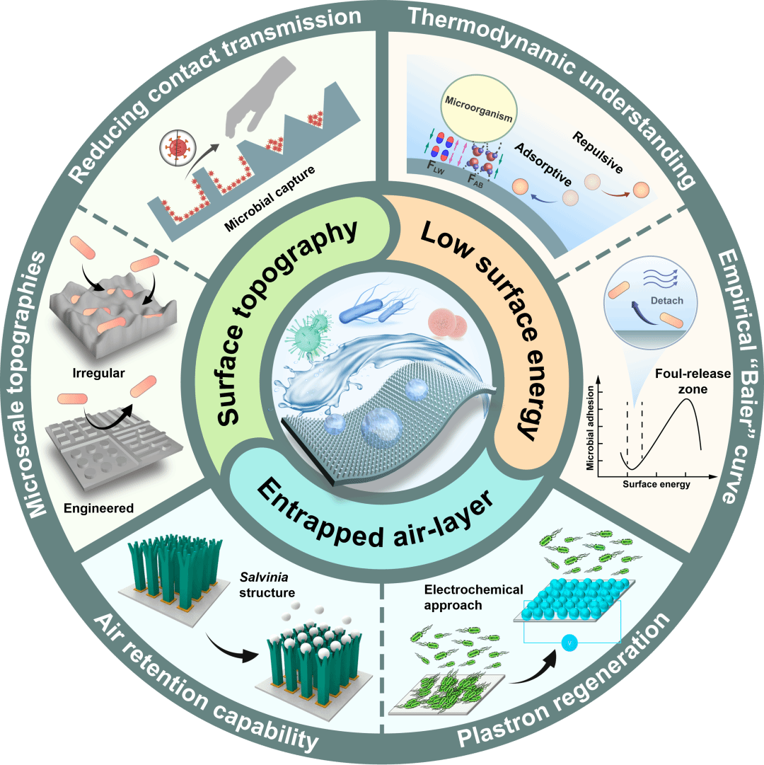 仿生超疏水表面具有对抗真菌、细菌、病毒等微生物污染的特性已被广为报道。多数研究者认为,超疏水表面的抗生物污染能力主要来自于禁锢的空气层降低了固-液界面占比,且微生物接触到气-液界面时会被弹走而无法实现有效黏附。然而,部分超疏水表面被证明并不能有效防止微生物在表面的黏附及增殖,甚至在某些情况下会促进附着。因此,为何某些超疏水表面可以表现出高效的抗微生物黏附性能,而其他超疏水表面不能的矛盾性长期以来使研究人员感到困惑。为此,beat365亚洲体育官方网站蒋如剑副教授联合吉林大学任露泉院士团队赵杰教授在《Materials Today》期刊(IF=24.2)上发表题为“Bioinspired superhydrophobic surfaces, inhibiting or promoting microbial contamination?”的综述文章(https://doi.org/10.1016/j.mattod.2023.06.006),系统解释并阐明超疏水性与微生物黏附之间的关系及超疏水表面抗微生物黏附的作用机理。本文从超疏水表面禁锢的空气层,表面粗糙度、固体表面能三个与超疏水性能相关的因素出发,全面揭示了微生物粘附性和表面超疏水性之间的非直接相关性,阐明了表面粗糙度及微纳米形貌与固体低表面能不仅是构建超疏水表面的因素,同时也对微生物在表面的黏附产生了直接的影响(下图)。本文所得出的观点及结论对于优化超疏水表面的抗微生物黏附性能具有重要意义,在高接触表面、生物材料表面、个人防护设备(PPE)和其他医疗设备等的应用中可以有效实现对微生物在表面的黏附及流行性疾病的接触传播的控制。