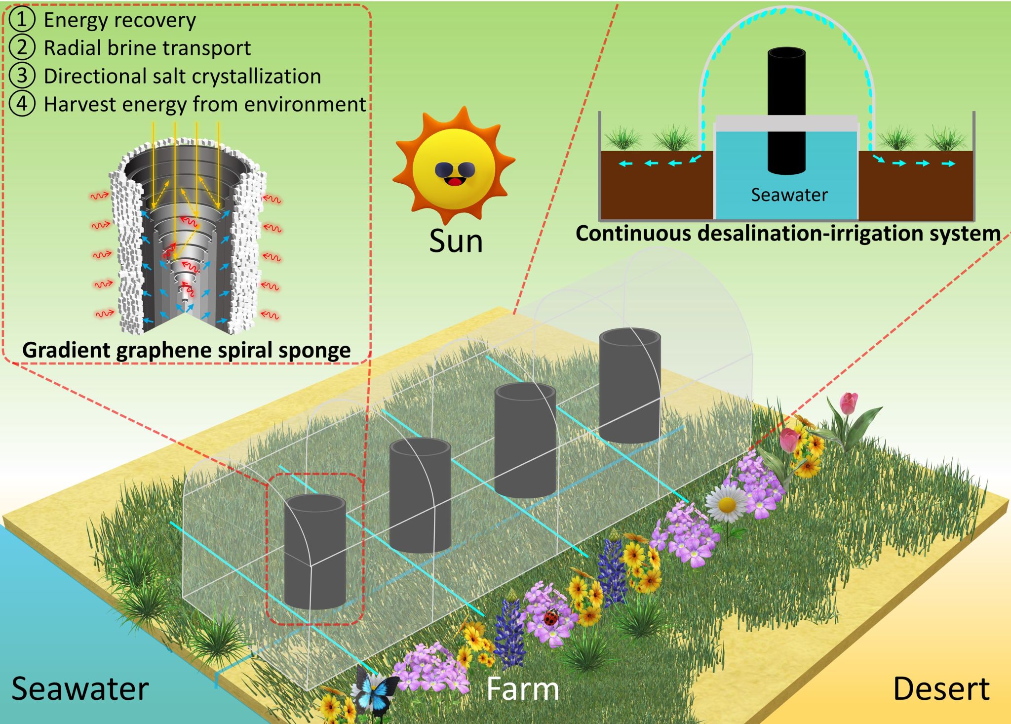 基于以上挑战,beat365亚洲体育官方网站李晨蔚教授团队首次提出一种创新策略,结合光还原和常压干燥技术,制备了具有三维梯度网络的石墨烯气凝胶。这种气凝胶在太阳能蒸发高浓度盐水方面展现出卓越的性能,并成功实现了零液体排放脱盐。该3D梯度石墨烯气凝胶的螺旋结构显著增强了能量回收效率,而其梯度网络结构则促进了盐水的径向输送和定向盐结晶。这两种结构的完美结合,使得气凝胶在太阳能蒸发(6.5 kg m-2 h-1)、盐收集(1.5 kg m-2 h-1)、零液体排放脱盐,以及长期耐久性(连续蒸发144小时)(在20wt%盐水中)方面均表现出色。在室外实验下,该3D梯度石墨烯气凝胶表现出3.1 kg m-2 h-1的超高产水速率,这一性能是目前报道的太阳能脱盐装置中最佳的产水性能。此外,研究团队还展示了一种基于该气凝胶的连续脱盐灌溉系统,该系统在偏远地区具有巨大的应用潜力,有望实现可持续的农业灌溉。这项工作不仅展示了一种新颖的太阳能蒸发器设计,并为设计耐盐高效的下一代太阳能海水淡化装置提供了重要的科学依据。