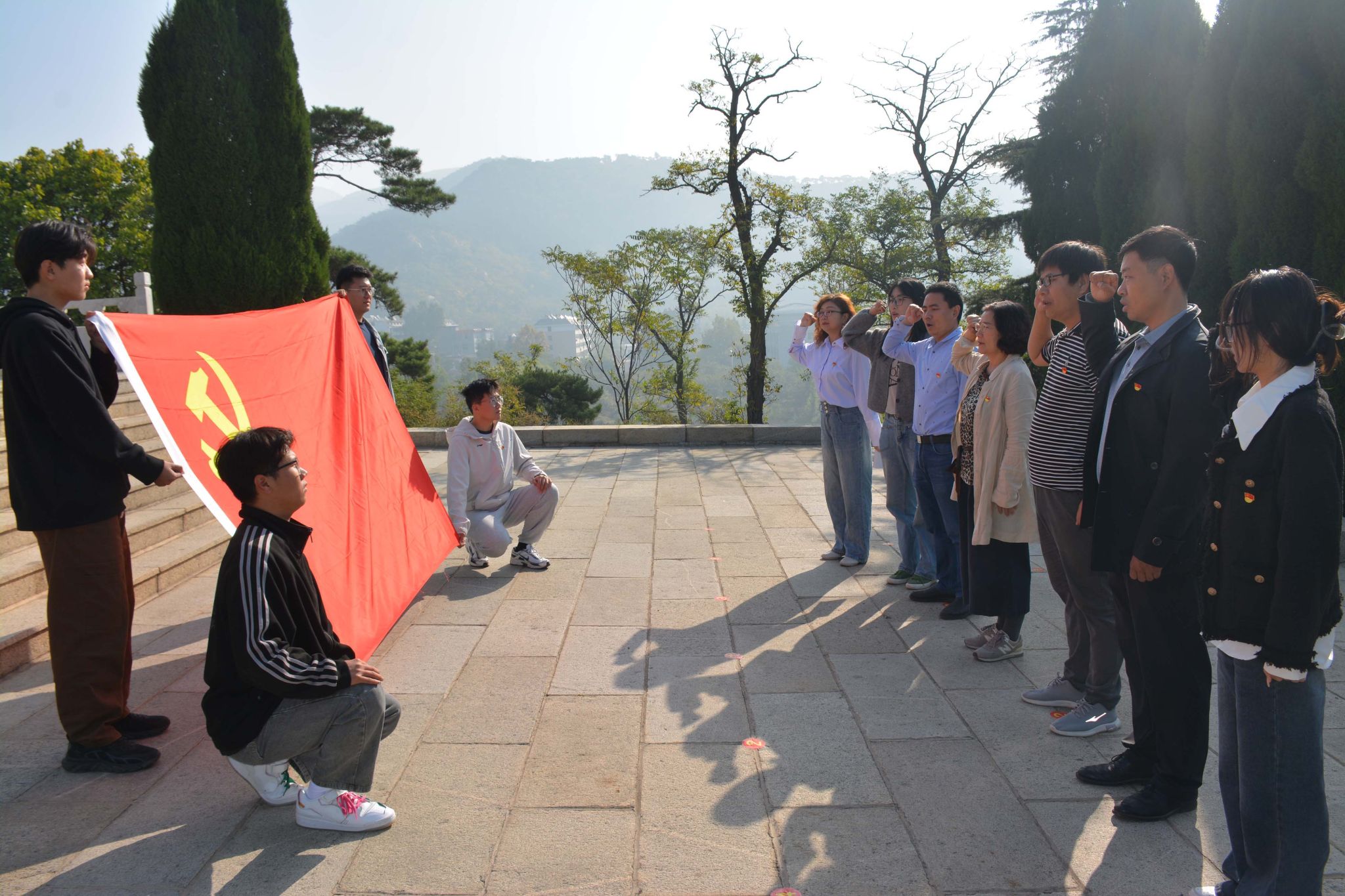 在徂徕山抗日武装起义纪念碑前,全体党员肃立行礼,面对鲜红的党旗,重温了入党誓词,以铮铮的誓言表达了弘扬传承红色基因,接续奋斗新时代的坚定决心。随后,全体师生党员面向纪念碑鞠躬默哀,表达了对革命先烈的无尽怀念和无限敬仰。