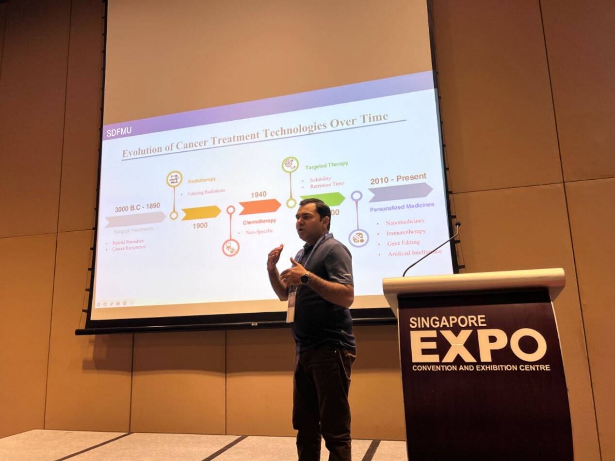 公司外籍博士后MUHAMMAD RIZWAN YOUNIS博士在大会上做了题为“Research In Pharmaceutics:Light-activated Inorganic Nanomedicines for Cancer Theranostics”口头报告。报告中,他详细介绍了其在多功能纳米材料与癌症治疗方面的研究成果,重点阐述了其团队在癌症早期诊断、靶向药物输送系统和多模态治疗平台等方面的研究进展,展示了公司的科研实力。