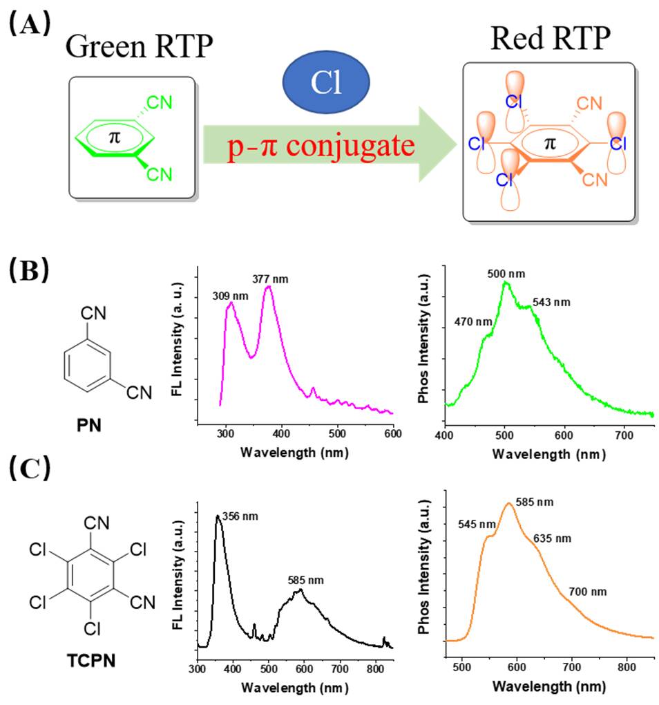 已报道的红色/NIR发射通常是通过扩展共轭体系获得,但稠合共轭体系的低溶解度、纯化困难等制约了其发展。苯环是构建共轭体系最简单、最基本的模块。然而,从单苯环中实现红色/NIR RTP仍然具有挑战性。利用p-π共轭,本文报道了一种具有红色/NIR RTP的单个苯环衍生物。其在585nm处显示最大RTP峰,在545nm、635nm和700nm处显示肩峰。这种构建模块与传统的扩展π共轭体系截然不同,可以为构建各种磷光材料提供指导,并重新激发人们对取代苯基础化学的兴趣。